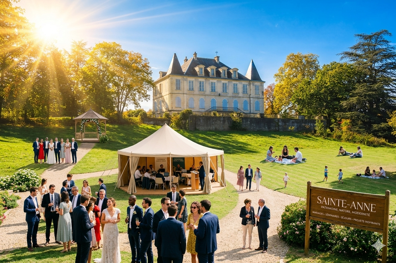 Entre patrimoine, nature et modernité, Sainte-Anne accueille mariages, séminaires, séjours et projets inspirants dans un cadre exceptionnel. Ancien domaine du XIXe siècle niché dans un parc arboré de 13 hectares, Sainte-Anne réunit l’élégance d’un patrimoine préservé et la liberté d’un lieu modulable.